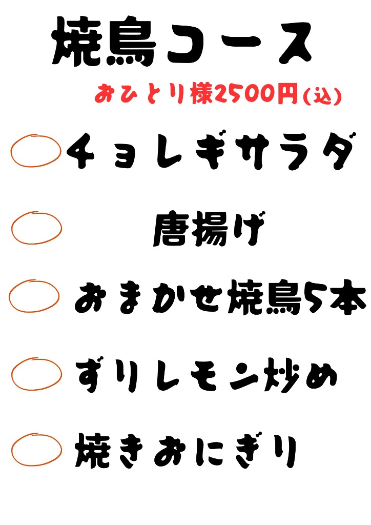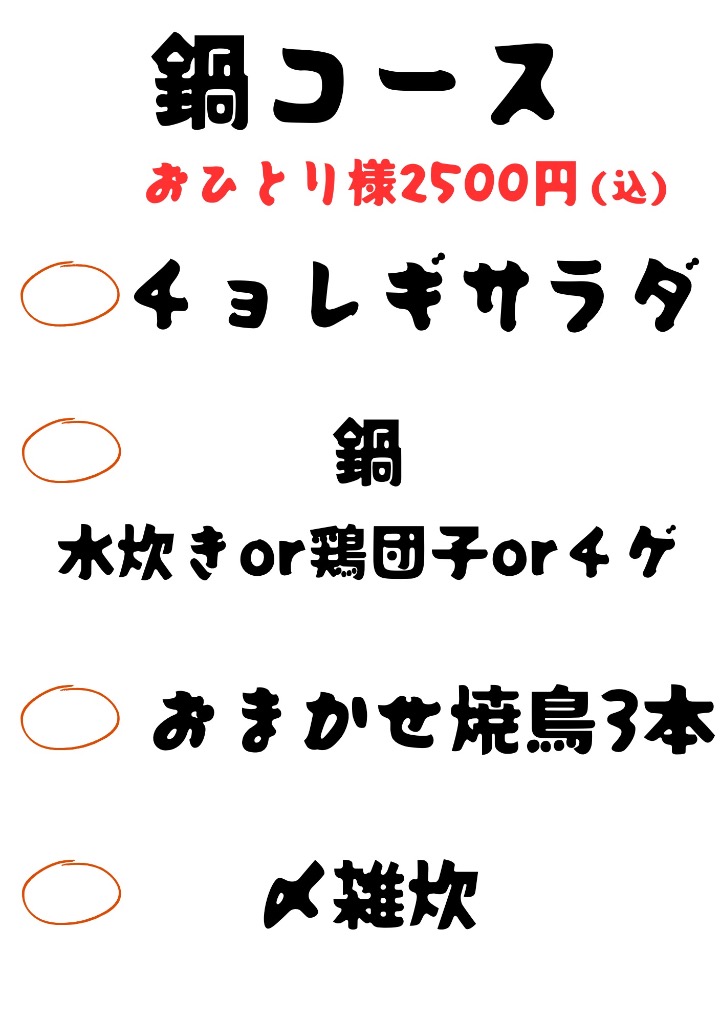 あ、焼き鳥コース、鍋コースをメニューに追加しました。写真貼っとくので見てみてください。おすすめです。